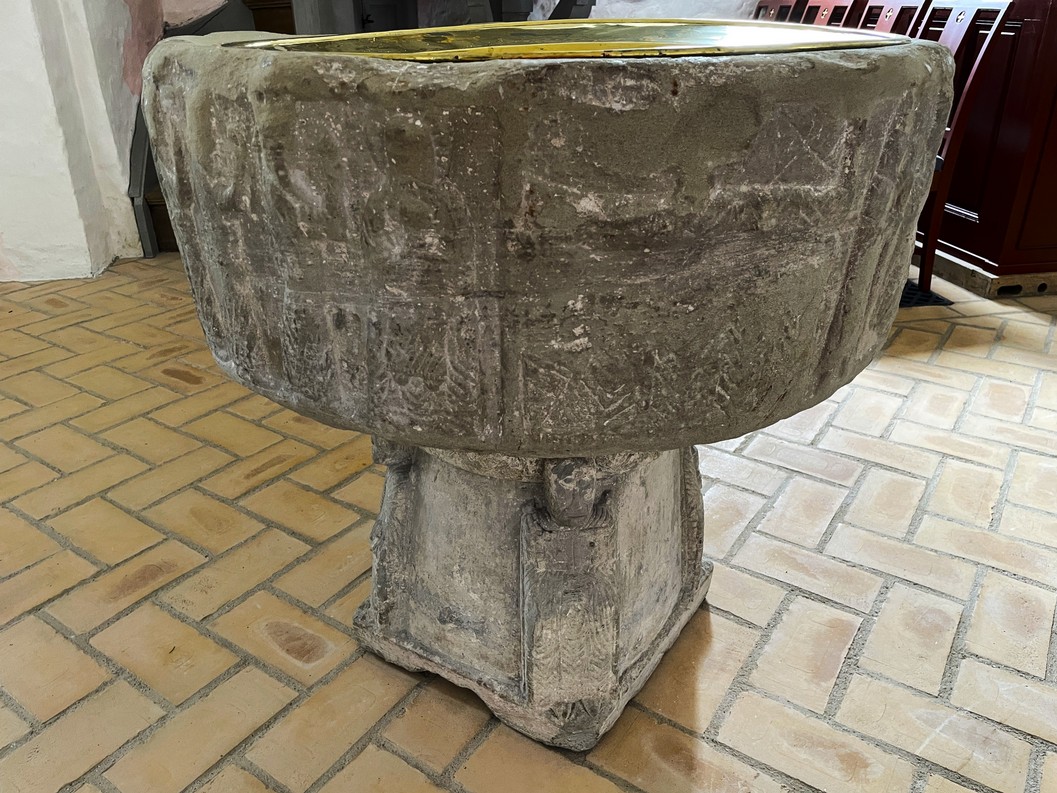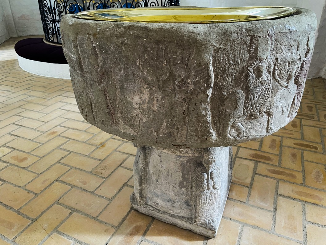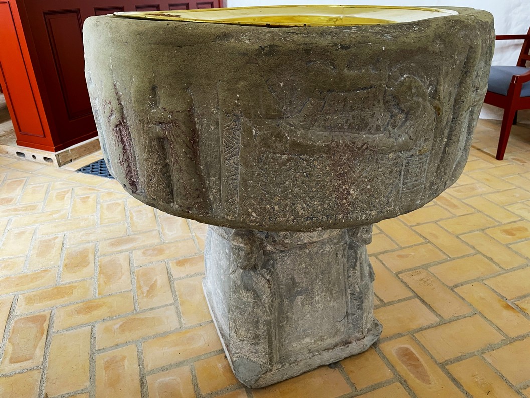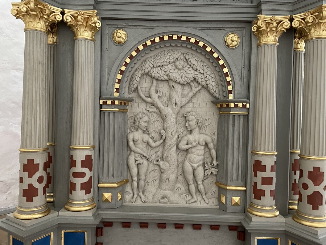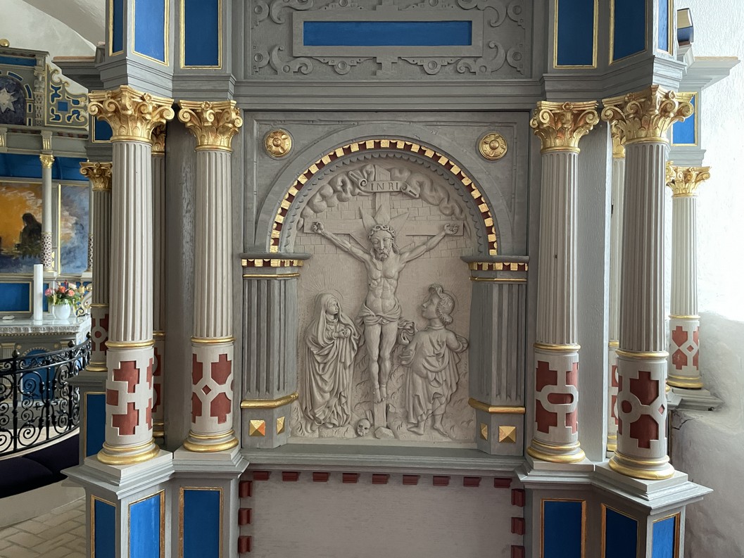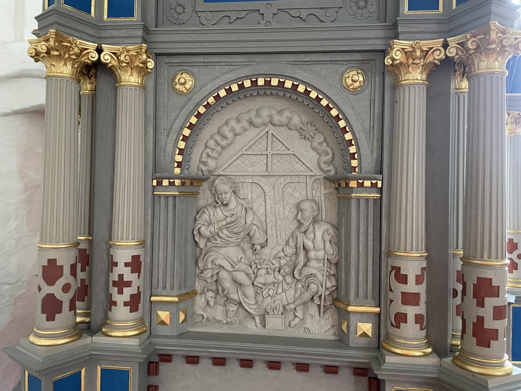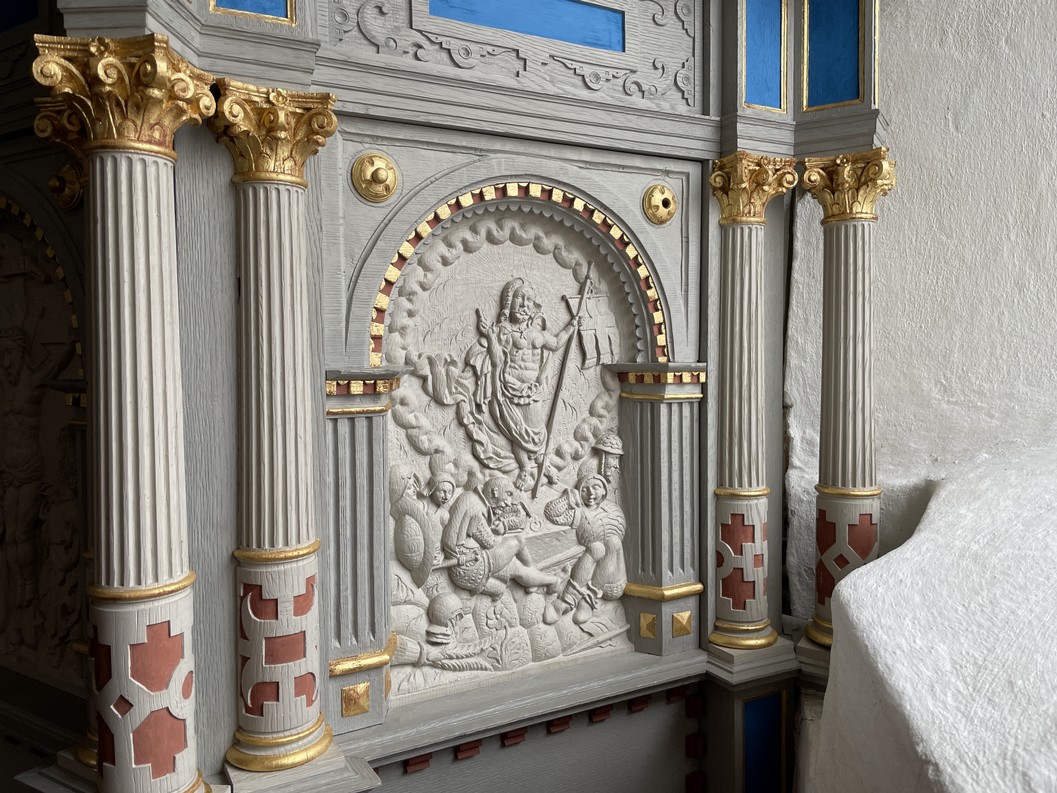 Den har fire fyldninger med relieffer fra Syndefaldet, Julenat, Korsfæstelsen og Opstandelsen.