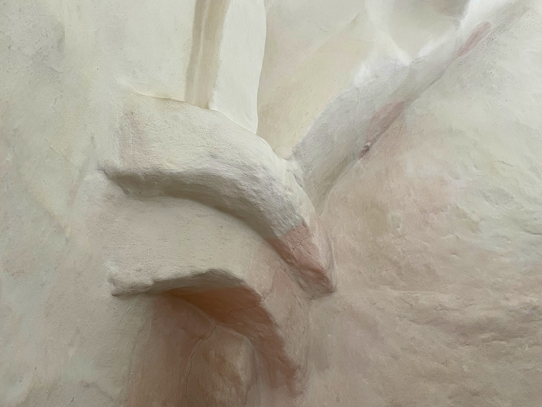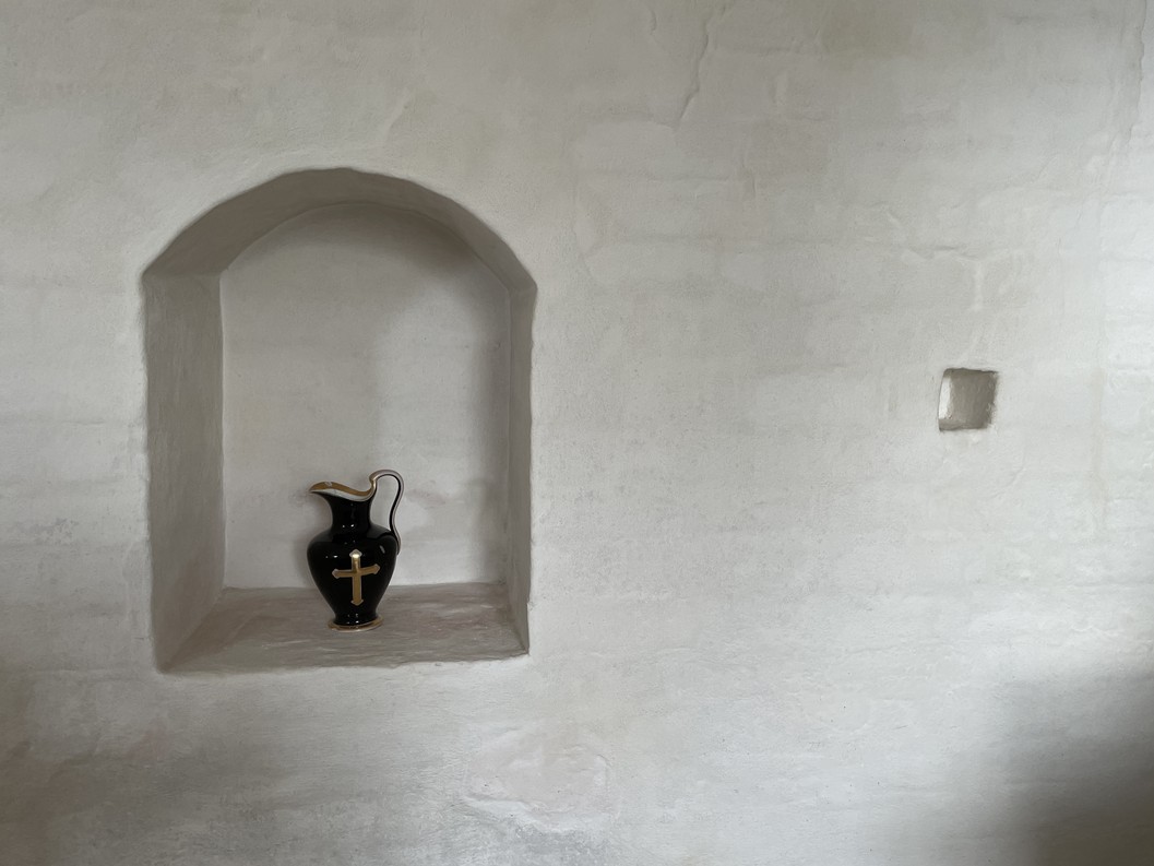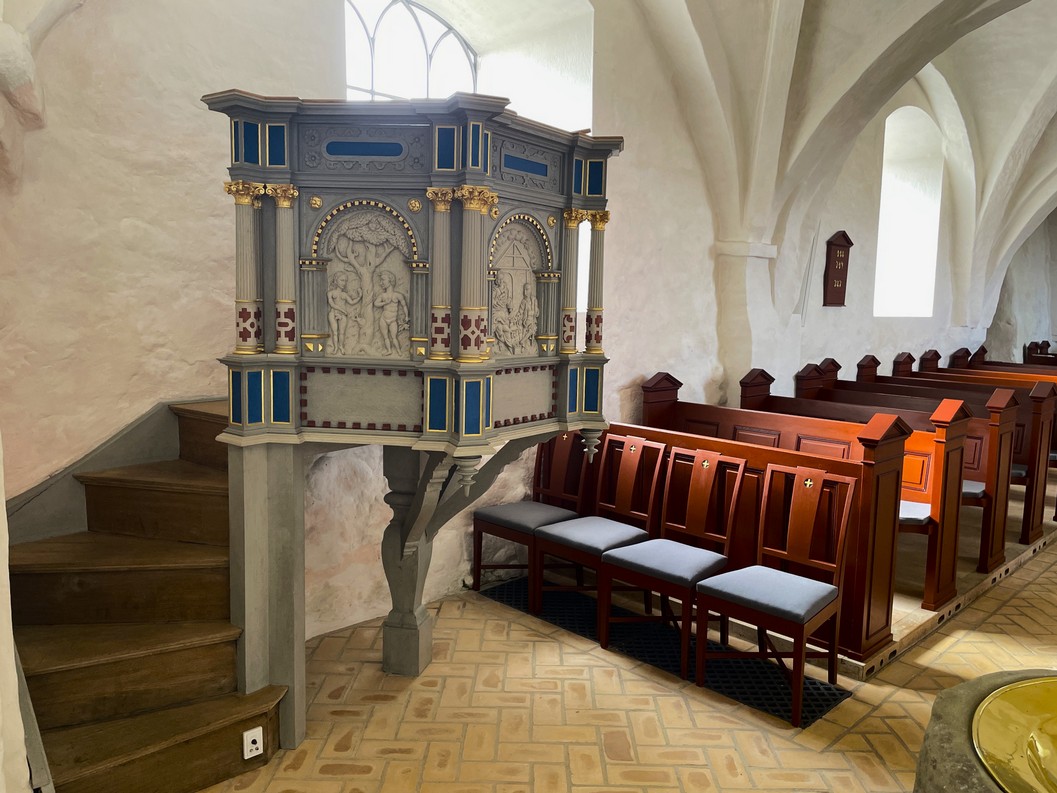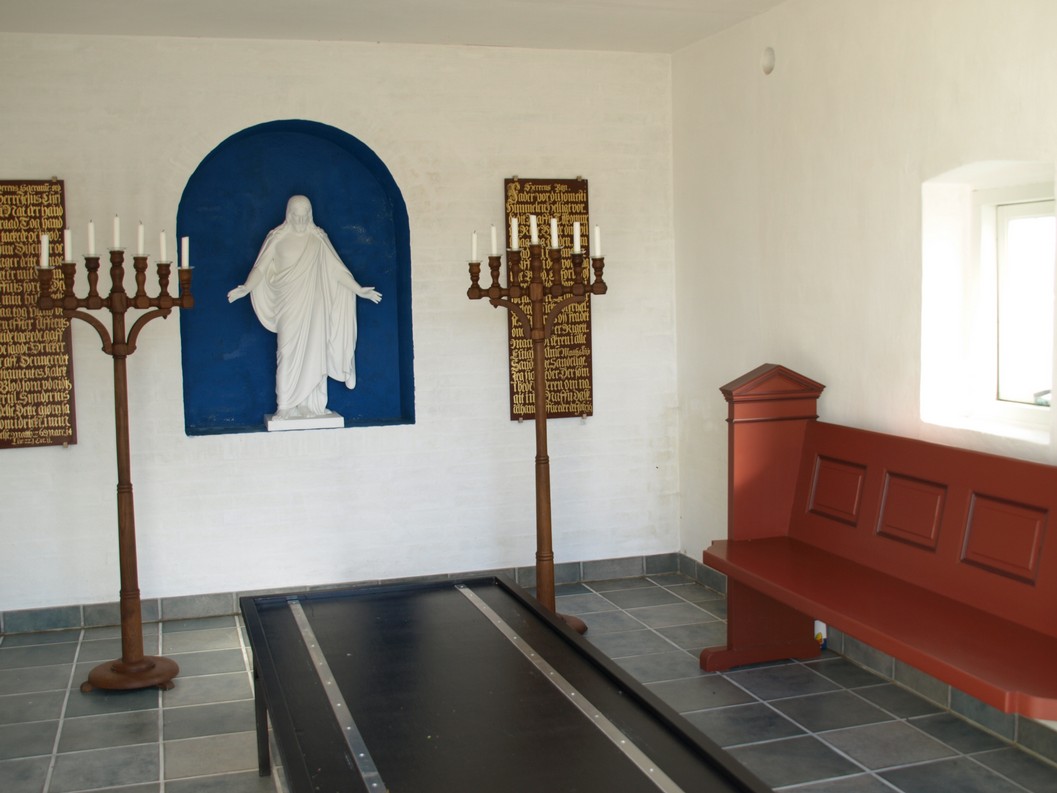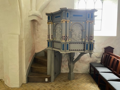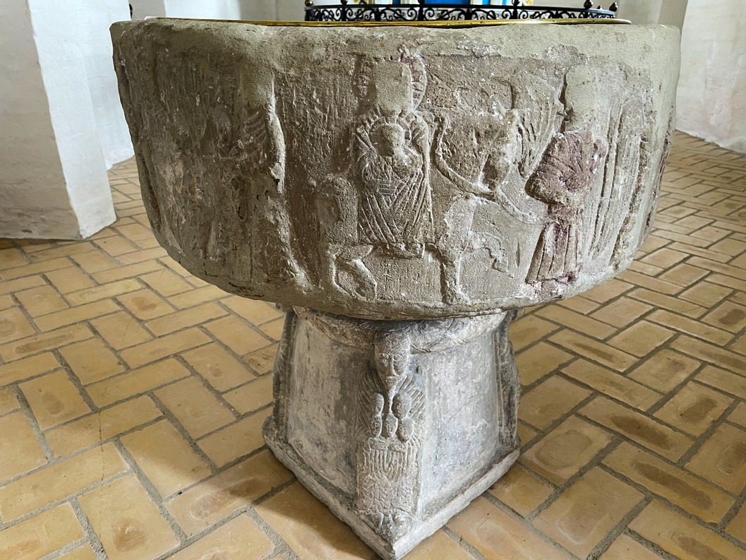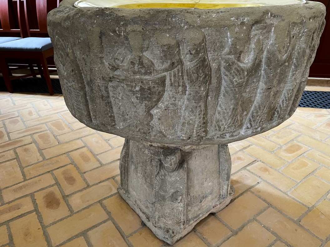 Den har fire fyldninger med relieffer fra Syndefaldet, Julenat, Korsfæstelsen og Opstandelsen.
