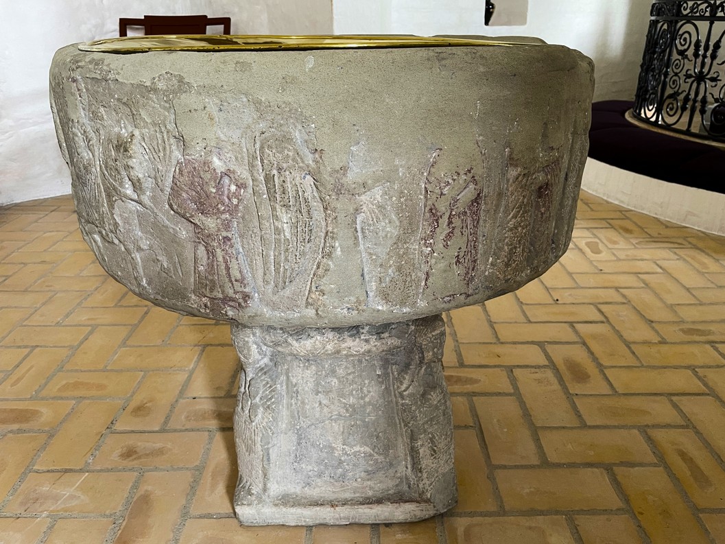 I følge bogen "Træk af Ellinge sogns historie" af Erling Windeballe er Døbefonten lavet af den gotlandske stenhugger Sighrafr, og viser Jesu bardomshistorie.