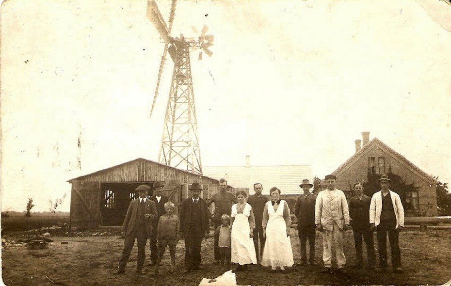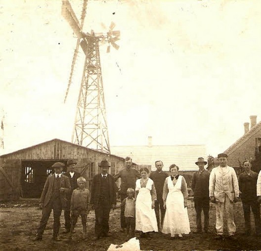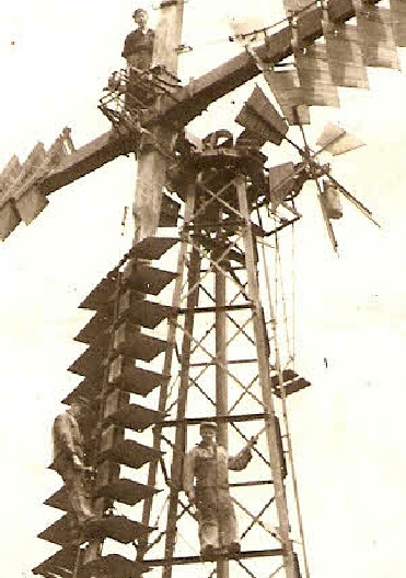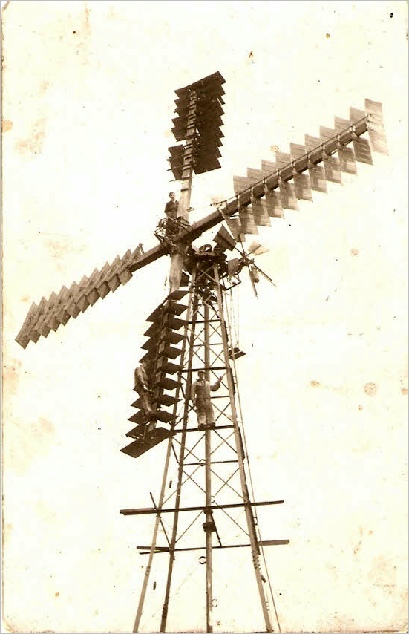 Bemærk de tre arbejdere (vi kender desværre ikke navnene på arbejderne) i møllevingerne.