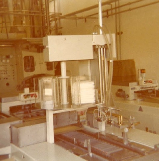 Billedet viser den sidste maskine, som Alfred konstruerede. Den var til Slotts Festis Fabrik i Uppsala, hvor man tappede i de berømte trekantede Tetra Pak kartoner, hvor hver enkelt karton fik påsat sugerør