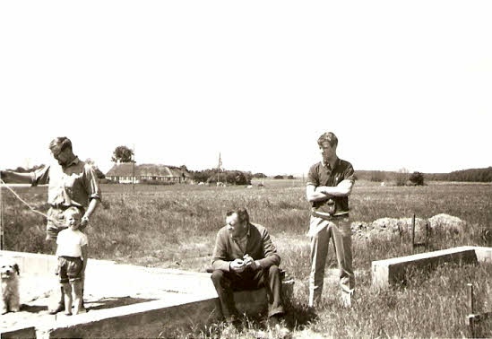 Alfred betragter grunden til det nye hus sammen med medarbejdere.