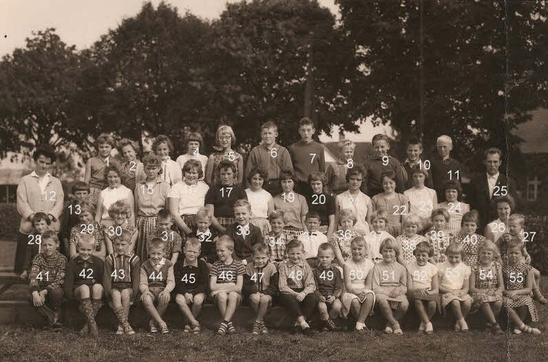 1 Lærer Hemmingsen 2 Mogens Bæk 3 Arne Bynke 4 Jørgen Rasmussen 5 Jens Kristian Hansen 6 Svend Clausen 7 Hans Holst 8 Ove Kristiansen 9 Frede Kærsgaard 10 Poul Andensen 11 Jørgen Jensen 12 Niels Henning Hansen 13 Kurt Jørgensen 14 Flemming Kristensen 15 ? | 16 Lars Hansen 17 Verner Hansen 18 Hans Haugh 19 Frede Hansen 20 Lærer Jensen 21 Mie Kærsgaard 22 Gudrun Johansen (Larsen) 23 Karen Hansen 24 Ella Rasmussen 25 Inga Hansen 26 Inge Christiansen 27 Grethe Høj 28 Tove Johansen 29 Grethe Pedersen | 30 Karen Hansen 31 Anne Lise 32 Edith Hansen 33 Inga Clausen 34 Holger Jensen 35 Gudrun Nielsen 36 Margit Hansen 37 Grethe Hansen 38 Gurdun Hansen 39 Ingelise Knudsen 40 Birthe Andersen 41 Grethe Sørensen 42 Kirsten Andersen 43 Ulla Kern 44 Solvejg Hansen | 45 Grethe Hansen 46 Jette Jørgensen 47 Fru Jensen 48 ? 49 Fru Hemmingsen 50 Karin Nielsen 51 Birgit Hansen 52 Ellen Christiansen 53 Bente Pedersen 54 Dagny Clausen 55 Solvejg Bruun 56 Rita Hansen 57 Kirsten Bjerregaard 58 Asta Pedersen 59 Karen Danielsen | 60 Ole Jensen 61 (lillebror til nr. 3) 62 Hans Kristian Nielsen 63 Allan Andersen 64 Arne Hansen 65 Helge |