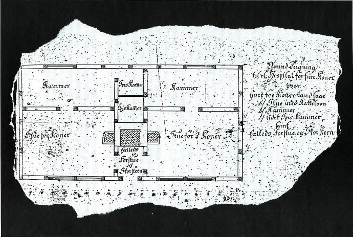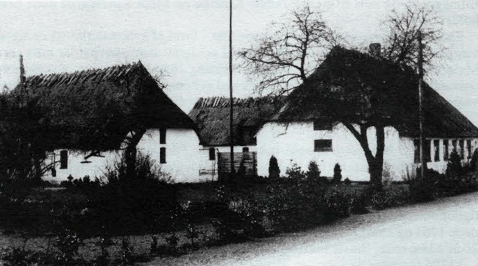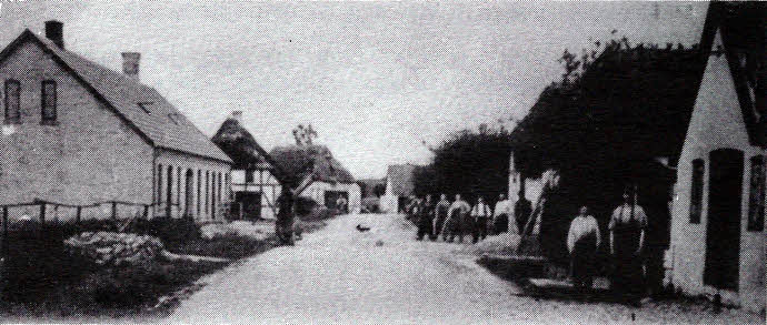 Til venstre: Forsamlingshuset med brugsen, hospitalet, kroladen.