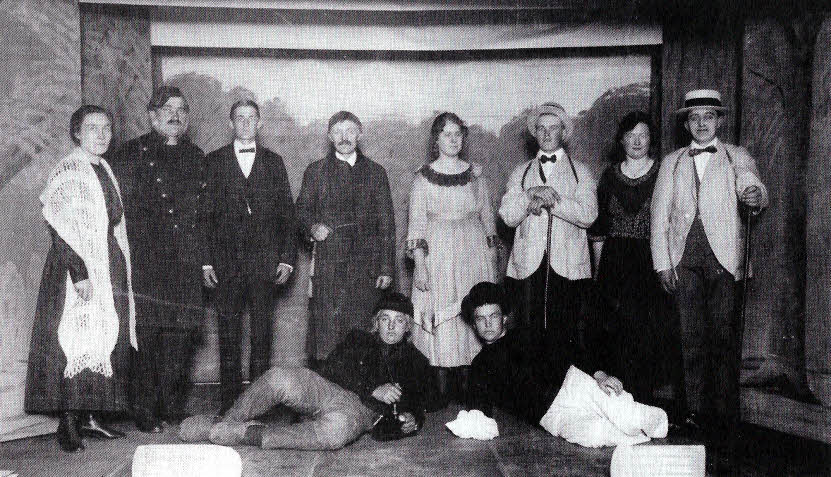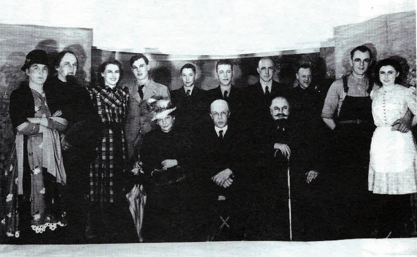 Dilettant 1939. Der opføres "Risom Mølle". Stående fra venstre: Dagny Ellegaard, Sigurd Bruun, Nancy Kristensen, Viggo Andersen, Helge Rosager, Henry Rasmussen, Bernhard Stjernegaard, Kristian Thorfeld, Frede Hansen, Ellen Danielsen.