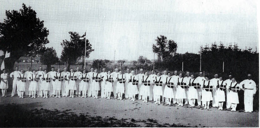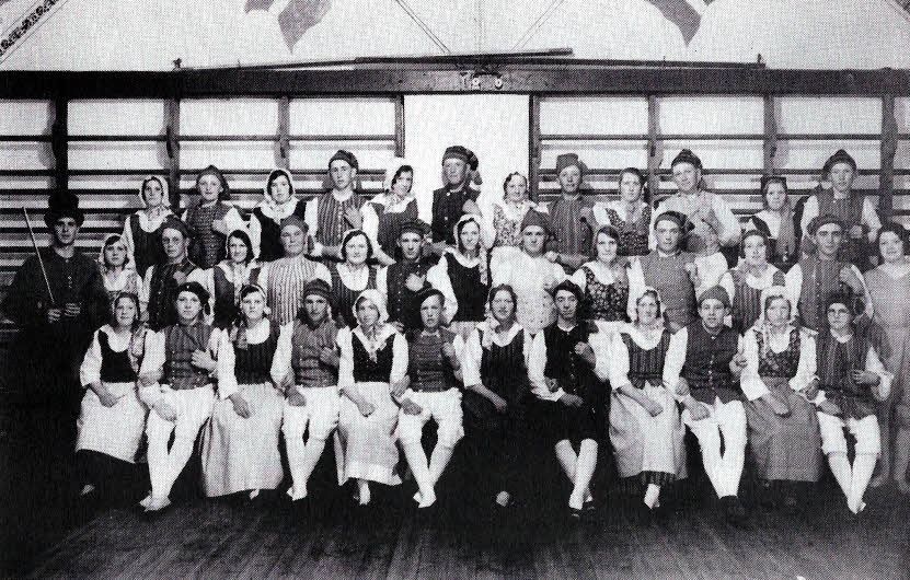 Folkedansere i Ellinge 1931-32. Holdet ledes af Margrethe Kristiansen, Mosegård,