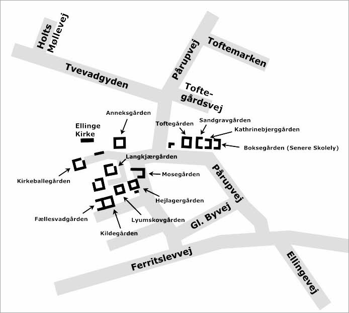 Ikke alle gårdene i Ellinge er med på denne tegning.