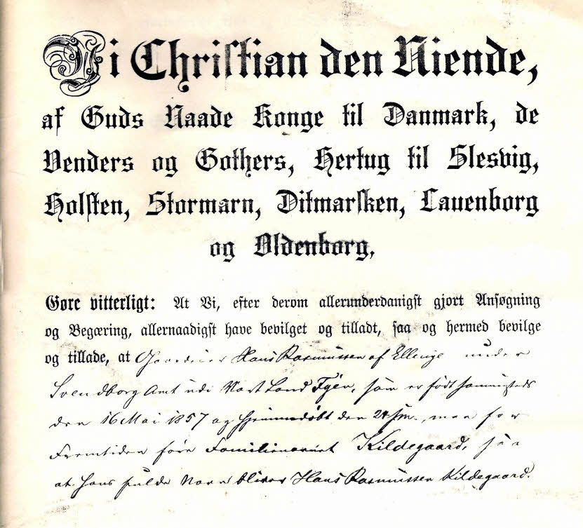 Gaardejer Hans Rasmussen af Ellinge under Svendborg Amt udi Vort Land Fyen, som er født sammesteds den 16 Mai 1857 og hjemmedøbt den 24 sm., maa for Fremtiden føre Familienavnet Kildegaard, saa at hans fulde Navn bliver: Hans Rasmussen Kildegaard”.