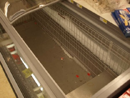 En gabende tom frysedisk. Før var den fyldt med is og dessert, nu er der kun kold luft - ligesom det ser ud på mange af hylderne, som i flere år ellers ligefrem har bugnet med varer.