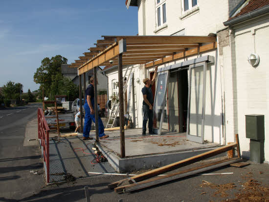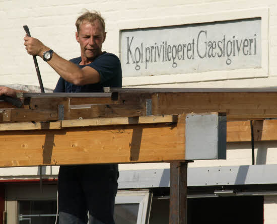 Helle fortalte, at huset er sat til salg, og derfor er de gået i gang med at rive indgangen til den lukkede købmandsforretning ned.