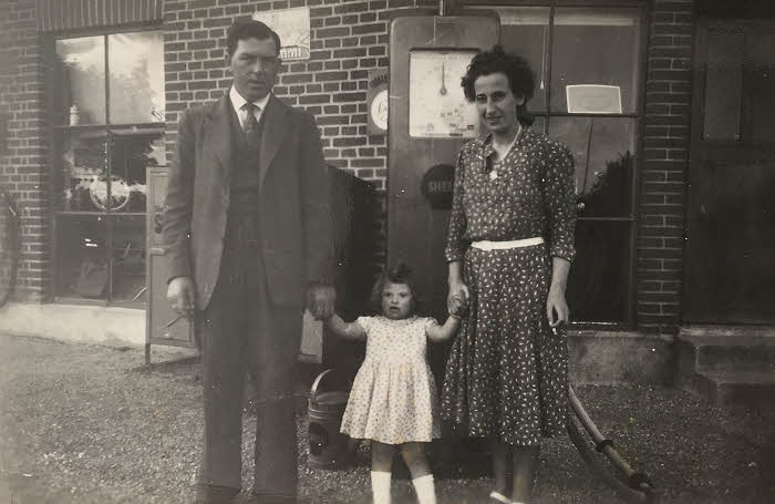 Karl og Bodil Hansen med datteren Toveforan autoværkstedet i Frørup, som Karls søster Astrid havde.