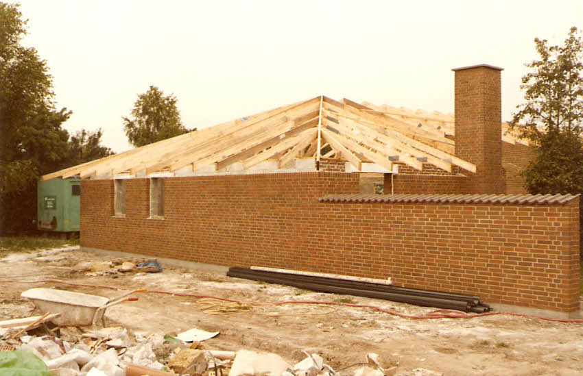 Den nye privatbolig med folkerum og garage under bygningen i 1981, set nogenlunde der hvor der nu er offentlig sti fra Pårupvej til genbrugsigloerne.