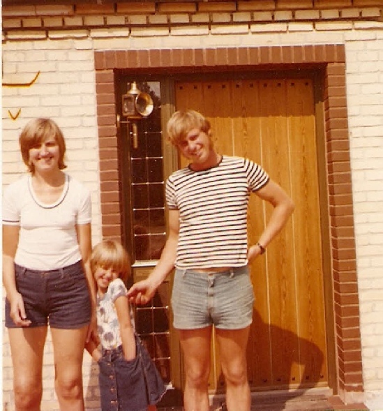 Inge og Bendt Bromose Jensen, med datteren Karin foran indgangen til privaten i ”Skolely” i 1976.