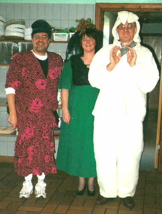 Charlotte Kroneder og jeg blev menige bestyrelsesmedlemmer, og her er vi fanget af Anne Henriksen, da foreningen afholdt tøndeslagning til Fastelavn i 2001.