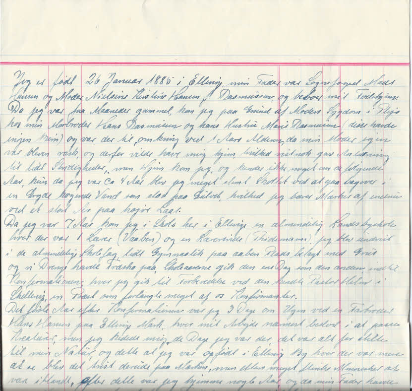 Jeg er født 26 Januar 1885 i Ellinge. min Fader var Sognefoged Mads Hansen og Moder Nilsine Kirstine f. Rasmussen, og beboer mit Fødehjem.