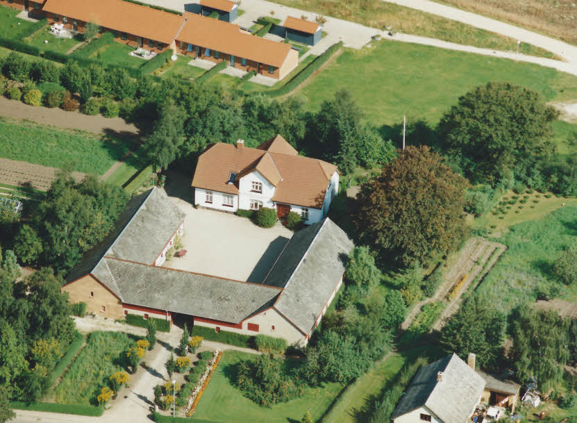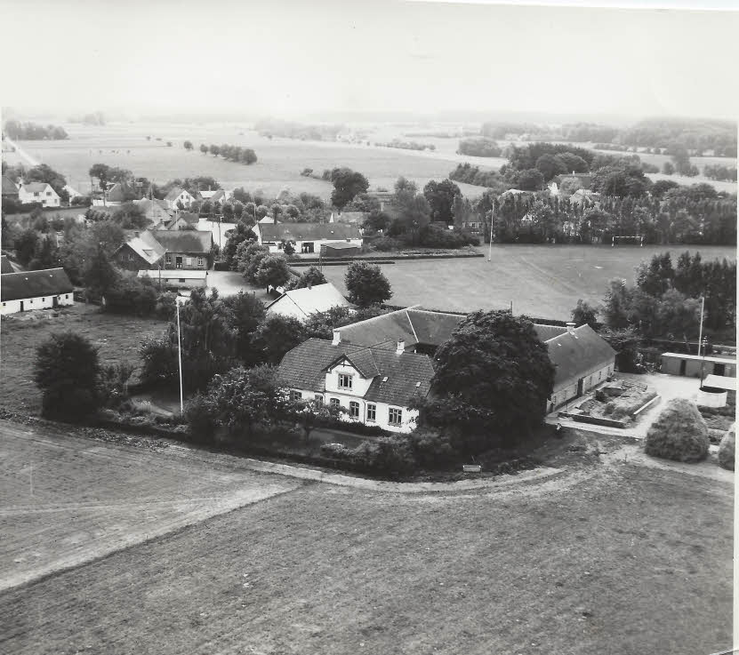Dette foto, som er fra ca. 1947-48, kan man se Toftegård, og nederst til venstre er bungalowen som blev bygget i 1943.