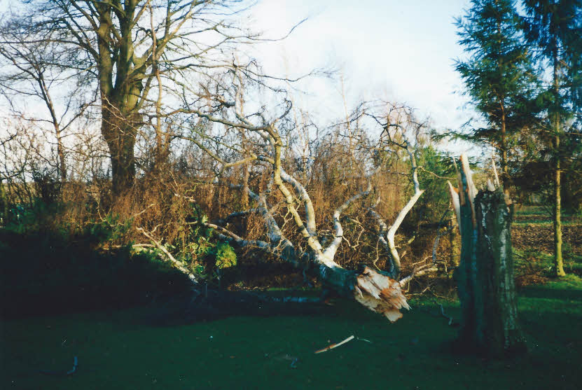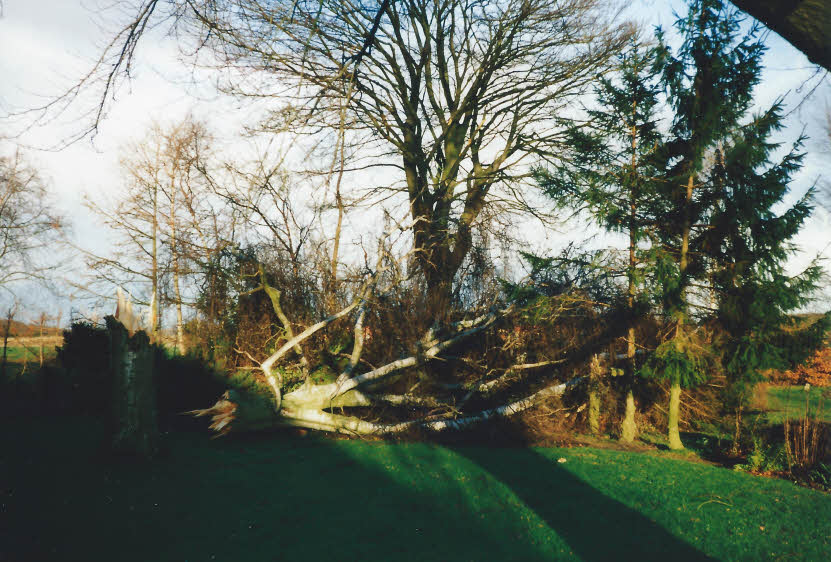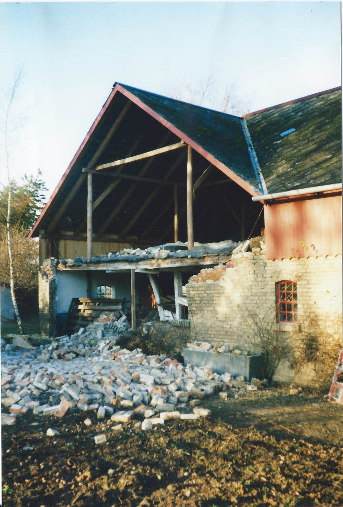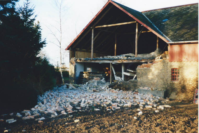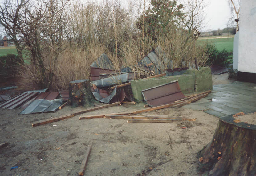 En del at taget fra Karetmagerens hus ligger inde på Toftegård efter en storm, formentlig omkring 1989-90.