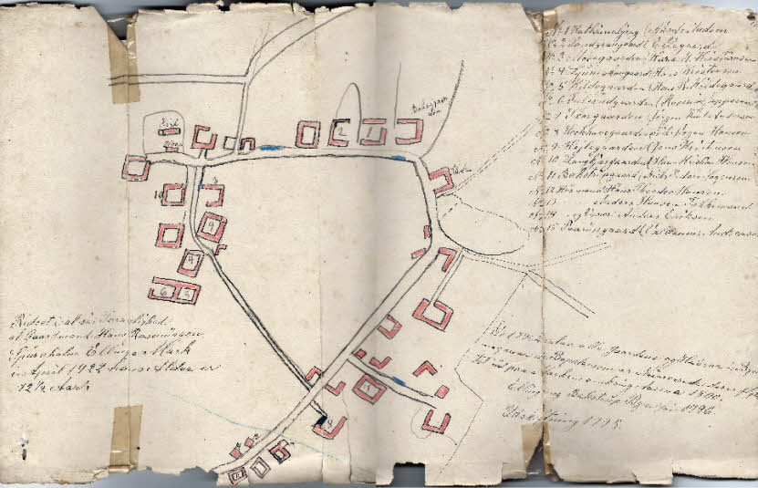 Undertegnede Kammerjunker Sigismund Wolff Veit de Mylius, Besidder af Stamhuset Rønningesøegaard m.m. erkjender at have solgt ligesom jeg herved sælger til Fæstegaardmand Hans Sørensen den under Stamhuset Rønningesøegaard hørende Gaard Matk. No 6a i Ellinge Bye og Sogn Vinding Herred Svendborg Amt hvis Hartkorn udgjør 3 Tdr. 4 Skp. ” Fdk. 1 3/4 Alb. og Gammelskat 31 Rd som Kjøberen tidligere har haft i Fæste paa følgende Vilkaar.