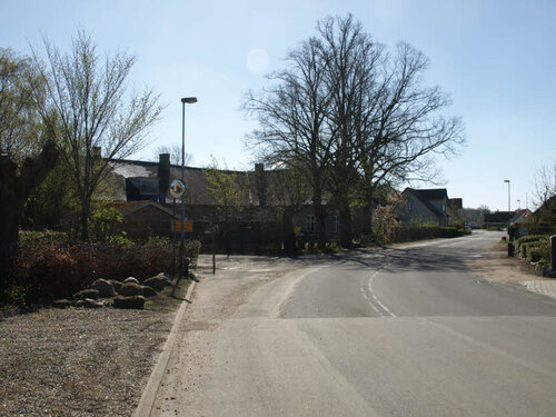 Med det hvide tag er det "Husflidskolen". Til venstre anes lidt af "Skolely". Ud til Pårupvej ses Ellinge Skole, og hos bageren står et par svende og holder pause i døråbningen.