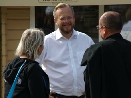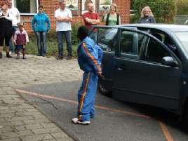 Den første der kom ud af bilerne, drønede hen, og gav hånd til børn og forældre, som stod for at tage imod.